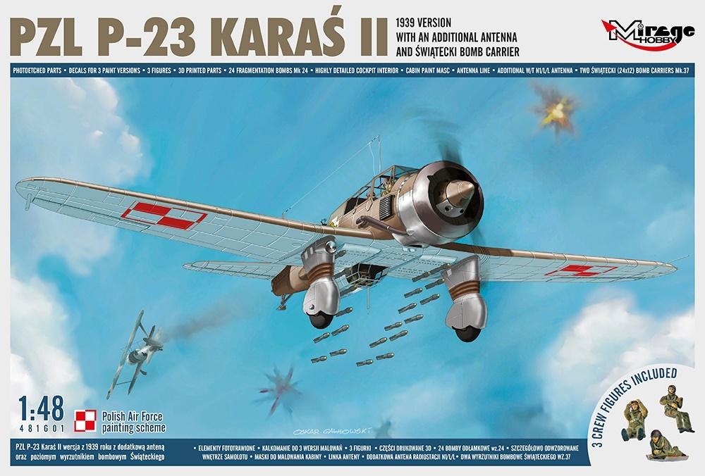[Opis modelu] Plastikowy model do sklejania w skali 1:48 ELEMENTY FOTOTRAWIONE KALKOMANIE DO 3 WERSJI MALOWAŃ 3 FIGURKI CZĘŚCI DRUKOWANE 3D 24 BOMBY ODŁAMKOWE wz.24 SZCZEGÓŁOWO ODWZOROWANE WNĘTRZE SAMOLOTU MASKI DO MALOWANIA KABINY LINKA ANTENY DODATKOWA ANTENA RADIOSTACJI N1/L/L DWA WYRZUTNIKI BOMBOWE ŚWIĄTECKIEGO WZ.37 [Rys historyczny] Model przeznaczony dla modelarzy zaawansowanych Samolot PZL.23 Karaś został zaprojektowany przez inż. Stanisława Praussa przy współpracy z dr inż. Franciszkiem Misztalem w Państwowych Zakładach Lotniczych w Warszawie na zamówienie Polskiego Lotnictwa Wojskowego. Prototyp PZL.23 został oblatany w sierpniu 1934 r przez kpt. pil. Bolesława Orlińskiego. W 1936 r. wyprodukowano 40 Karasi A (oznaczanych też Karaś I), a w latach 1937-1938, 210 Karasi B (oznaczanych też Karaś II), które różniły się od Karasi A innym silnikiem, usunięciem slotów z przykadłubowej części skrzydeł i usterzeniem poziomym z odciążeniem rogowym. Samoloty Karaś B w 1936 r. weszły do użycia w eskadrach liniowych pułków lotniczych. Ostatnie partieprodukcyjne Karasi, dostały dodatkową górną antenę (odwrócone "L"). Dla samolotów PZL-23 oraz PZL-43 opracowano również poziomy wyrzutnik bomb odłamkowych Świątecki 24 x 12 wz. 37...