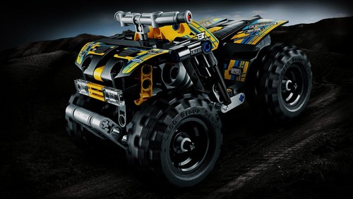 Pokonuj nawet najtrudniejszy teren dzięki wytrzymałemu quadowi LEGO Technic! Ta solidna, potężna maszyna charakteryzuje się kolorystyką łączącą żółć, czerń, błękit i szarość i wyposażona jest w niezwykle efektowne kalkomanie, duże opony z głębokim bieżnikiem, wytrzymałe podwozie z wysoko umieszczonymi błotnikami, wciągarkę do pracy w najtrudniejszych warunkach oraz potężny napęd odciągowy pozwalający uzyskać duże prędkości. Przygotuj się na jazdę pełną mocnych wrażeń! Połączenie z zestawem 42033 Błyskawica pozwoli stworzyć niesamowicie szybki wyścigowy pojazd terenowy! 7-14 lat