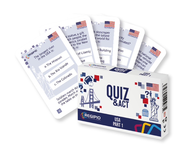 QUIZ & ACT USA to 50 kart dydaktycznych z pytaniami dotyczącymi kultury i historii Stanów Zjednoczonych.