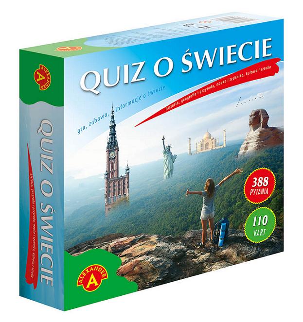 Quiz o Świecie - fascynująca gra i świetna zabawa, w trakcie której uczestnicy odpowiadają na pytania dotyczące historii, geografii i przyrody, nauki i techniki oraz kultury i sztuki świata. Na 97 kartach jest 388 pytań i 1164 warianty odpowiedzi. Podczas gry trzeba wykazać się również swoją zręcznością, strzelając z katapulty do celu. Quiz o Świecie to atrakcyjna i emocjonująca rozrywka dla całej rodziny, a jej uczestnicy mogą w czasie zabawy poszerzyć swoje informacje o świecie.