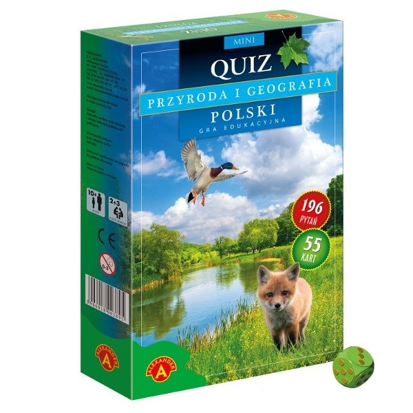 To gra, w której uczestnicy biorą udział w emocjonującej zabawie, a jednocześnie zdobywają wiele ciekawych informacji na temat geografii i przyrody Polski. Gracze mają do dyspozycji 46 kart, na których znajdują się 184 pytania i 368 odpowiedzi. Quiz - przyroda i geografia Polski to dobry przykład łączenia zabawy z nauką. Gra dla 2-3 graczy. Wiek: 10+