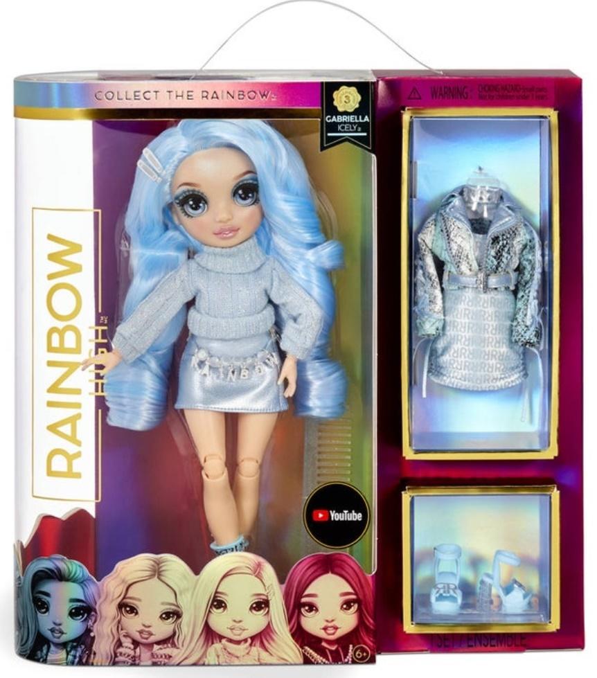 Lalka Rainbow High Ice Gabriella, ubrana w lodowe ubrania oraz posiadająca jasno niebieskie włosy. Posiada dodatkowe ubranka.