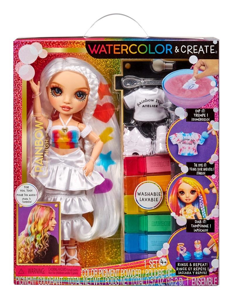 Nowa seria bestsellera! Rainbow High Watercolor & Create Fashion. Lalki inspirują kreatywność. Dzięki nowej serii można zaprojektować swoje własne lalki metodą Tie-Dye! Możesz zaprojektować im ubrania oraz zmienić kolor włosów. Zmywalne farbki można używać nawet na własnych włosach! Następnie po prostu spłucz i powtórz i zrób to od nowa. W serii znajdują się trzy nowe lalki, wszystkie w białym kolorze dla najlepszego efektu farbowania.