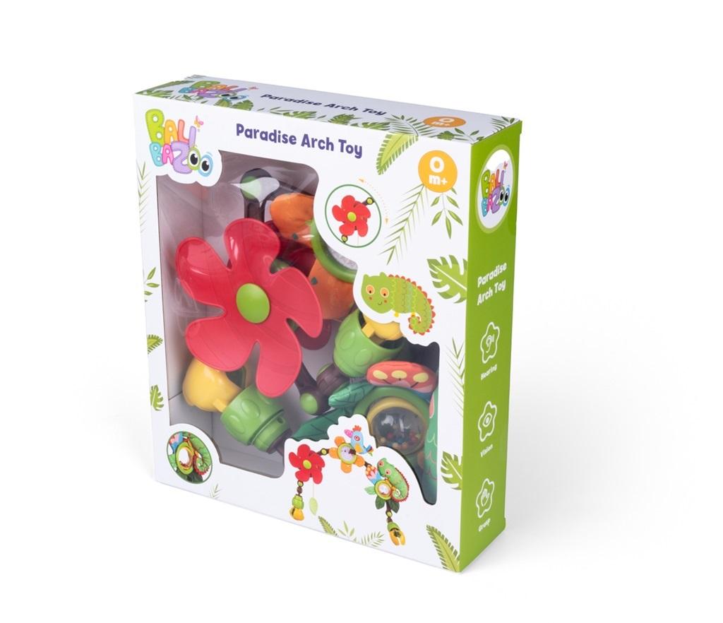 Do pluszakowego świata Balibazoo zawitał łuk z zabawnym kameleonem i bajecznie kolorowymi kwiatkami, aby każdy maluszek mógł cieszyć się urokami tej rajskiej krainy w zaciszu własnego domku czy podczas spaceru w wózeczku. Sprytne klipsy pozwolą przymocować zabawkę w dowolnym miejscu, a ruchome przeguby ramion umożliwią dostosowanie ustawienia łuku do potrzeb dziecka, zapewniając mu wygodny dostęp do wszystkich niespodzianek, które zabawka w sobie kryje. Znajdziemy tu szeleszczące elementy, kwiatek - wiatraczek, który uruchamia się, poprzeć pociągnięcie pluszowego listka oraz grzechotkę w formie kuli z kolorowymi koralikami. Zróżnicowane faktury materiałów zastosowane w zabawce stymulują zmysł wzroku i dotyku najmłodszych, zachęcając ich do odkrywania świata!
