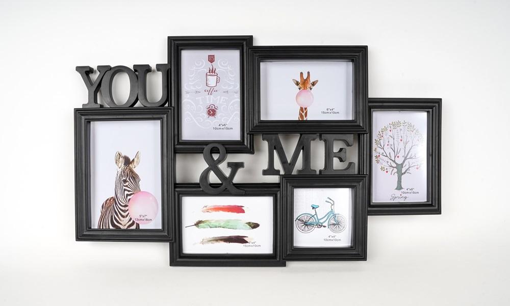 Plastikowa ramka na 4 foto 10 x 15 cm, 1 foto 10 x 10 cm a 1 foto 13 x 18 cm, rozmiar ramki 57 x 36 cm, do zawieszenia