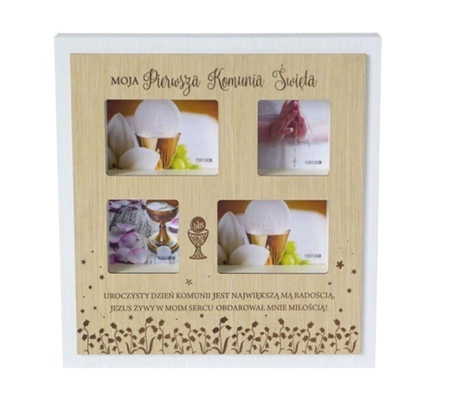 Ramka gigant do zdjęć to wspaniały pomysł, by uwiecznić wspomnienia z Pierwszej Komunii Świętej. Wykonana z solidnej płyty MDF w drewnopodobnej okleinie, wraz z sentencją, posiada 4 miejsca na zdjęcia. Na tylnej ściance ramki są dziurki do zawieszenia na ścianie. Cechy szczególne: typ: ramka do zdjęć do powieszenia lub postawienia, wielkość orientacyjna: 40 cm x 40 cm x 4 cm zdobienie: okleina idealnie imitująca drewno, grawer styl: skandynawski, nowoczesny, tradycyjny.