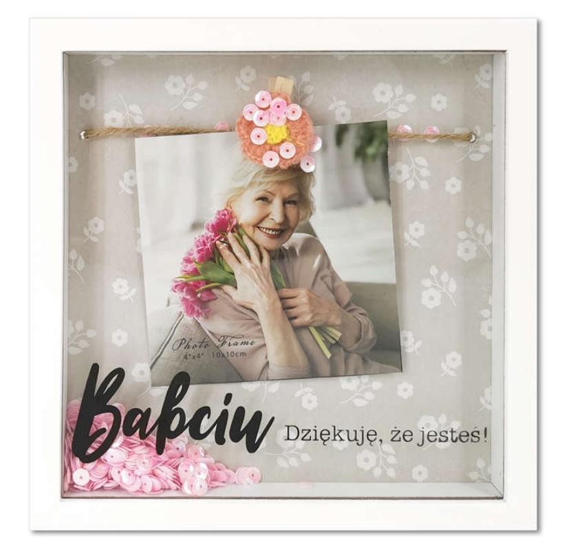Kwadratowa ramka na zdjęcie dla Babci, zapakowana w wygodne pudełko.