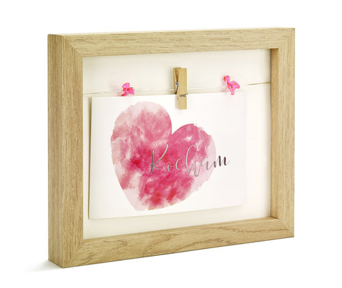 Designerska ramka na zdjęcia z dedykacją KOCHAM w kolorze drewna, którą można powiesić i postawić. Ramka podświetlana jest dwiema lampkami LED w kształcie dwóch miniaturowych flamingów. Zdjęcie o wymiarach 10 x 15 cm można zawiesić na lince przy pomocy drewnianego mini spinacza. W miejscu docelowego zdjęcia umieszczona jest grafika o charakterze walentynkowym. Urocza dekoracja ściany, półki czy regału, wykonana z niezwykłą starannością, ze szczególnym zwróceniem uwagi na detale. Wraz ze zdjęciem stworzą idealny prezent na Walentynki lub inną okazję.