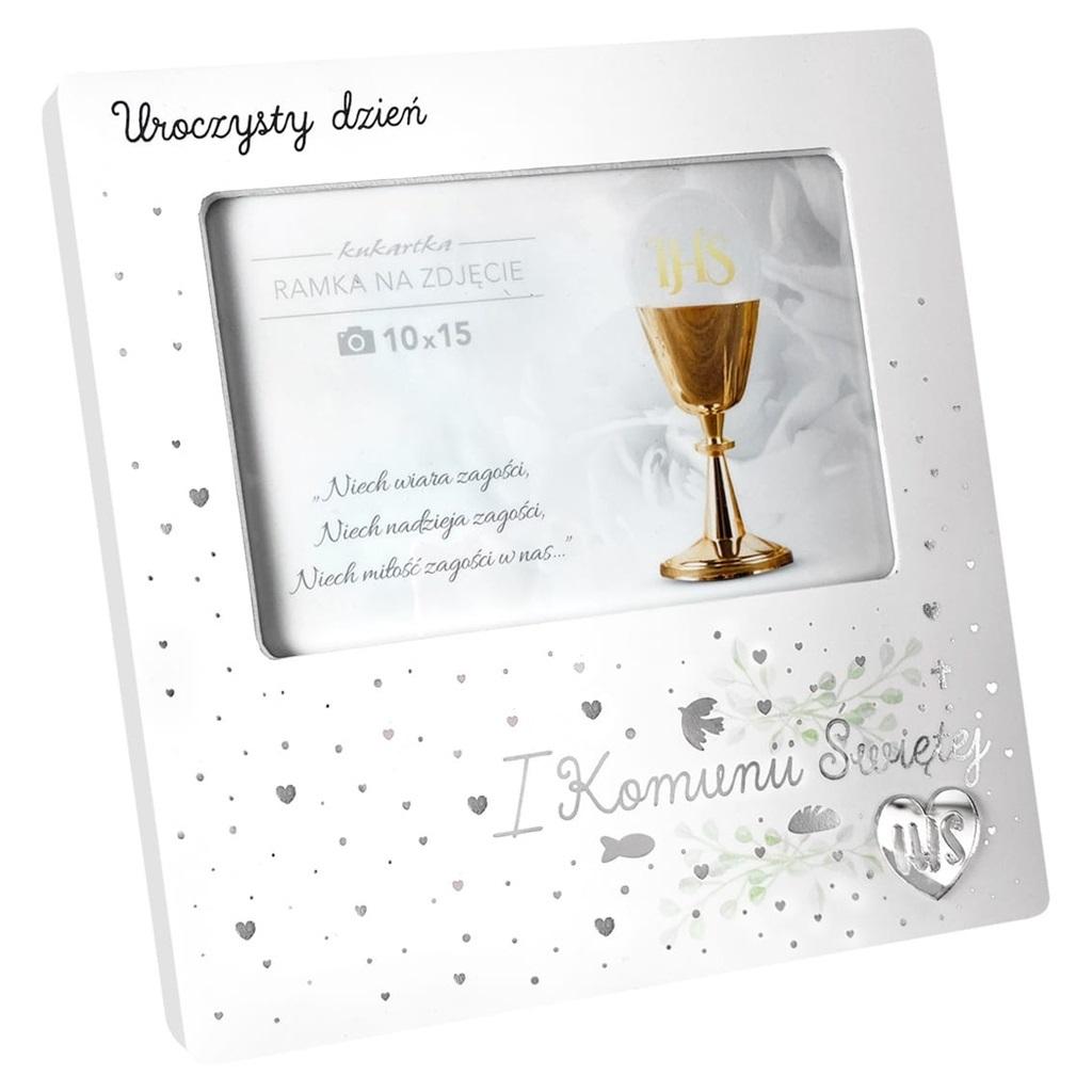 Ramka do zdjęć z serii Moments to wspaniały, niezapomniany pomysł na prezent komunijny. Wykonana z solidnej płyty MDF w drewnopodobnej okleinie. Ramki z serii Moments posiadają piękne, delikatne ozdoby oraz krótką sentencję upamietniającą daną okazję. Na tylnej ściance ramki jest haczyk do zawieszenia na ścianie i nóżka do postawienia. Cechy szczególne: typ: ramka do zdjęć do powieszenia lub postawienia, wielkość orientacyjna: 19 x 19 cm, mieści zdjęcie 10x15 cm, zdobienie: okleina idealnie imitująca drewno, grawer, lustrzany napis, styl: skandynawski, nowoczesny, tradycyjny, okazja: komunia