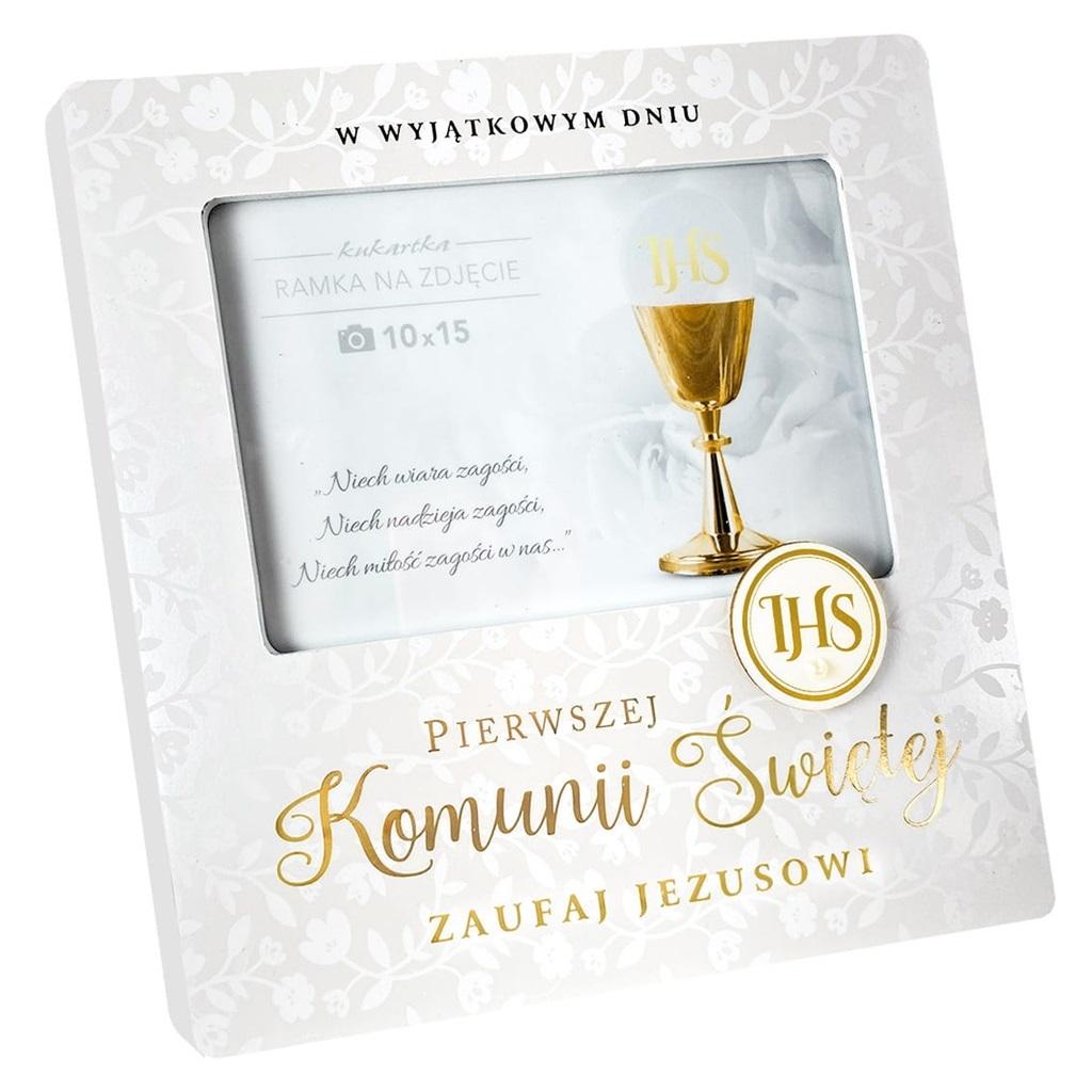 Ramka do zdjęć z serii Moments to wspaniały, niezapomniany pomysł na prezent komunijny. Wykonana z solidnej płyty MDF w drewnopodobnej okleinie. Ramki z serii Moments posiadają piękne, delikatne ozdoby oraz krótką sentencję upamietniającą daną okazję. Na tylnej ściance ramki jest haczyk do zawieszenia na ścianie i nóżka do postawienia. Cechy szczególne: typ: ramka do zdjęć do powieszenia lub postawienia, wielkość orientacyjna: 19 x 19 cm, mieści zdjęcie 10x15 cm, zdobienie: okleina idealnie imitująca drewno, grawer, lustrzany napis, styl: skandynawski, nowoczesny, tradycyjny, okazja: komunia