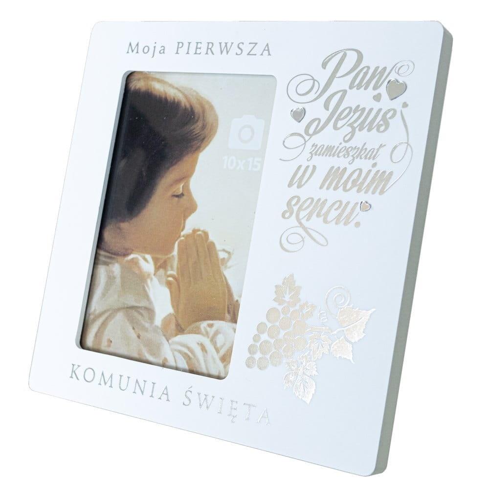 Ramka do zdjęć z serii Moments to wspaniały, niezapomniany pomysł na prezent komunijny. Wykonana z solidnej płyty MDF w drewnopodobnej okleinie. Ramki z serii Moments posiadają piękne, delikatne ozdoby oraz krótką sentencję upamietniającą daną okazję. Na tylnej ściance ramki jest haczyk do zawieszenia na ścianie i nóżka do postawienia. Cechy szczególne: typ: ramka do zdjęć do powieszenia lub postawienia, wielkość orientacyjna: 19 x 19 cm, mieści zdjęcie 10x15 cm, zdobienie: okleina idealnie imitująca drewno, grawer, lustrzany napis, styl: skandynawski, nowoczesny, tradycyjny.