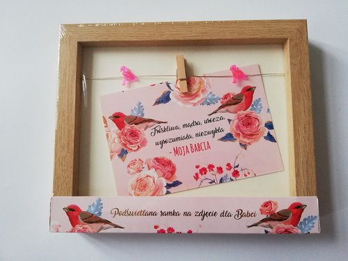 - stylowa, drewniana ramka na zdjęcia ze specjalną dedykacją dla Babci - podświetlana jest dwiema lampkami Led w kształcie flamingów - zdjęcie o wymiarach 10x15 cm do zawieszenia na lince za pomocą drewnianego mini spinacza - do powieszenia i postawienia - urocza dekoracja ściany, komody, półki czy regału - wykonana z niezwykłą starannością, ze szczególnym zwróceniem uwagi na detale - wraz ze zdjęciem wnuka/wnuczki stworzą idealny prezent na Dzień Babci wymiary: - szerokość: 22,7 cm - wysokość: 18,7 cm - głębokość: 2,9 cm