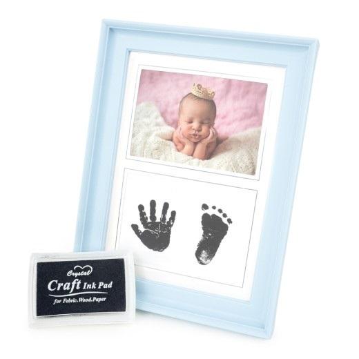 plastikowa ramka na zdjęcia, rozmiar ramki 15,5 x 20,6 cm, szerokość listwy 2 cm, do postawienia lub powieszenia, zawiera poduszkę z tuszem do wykonania odcisku dłoni lub stopy dziecka