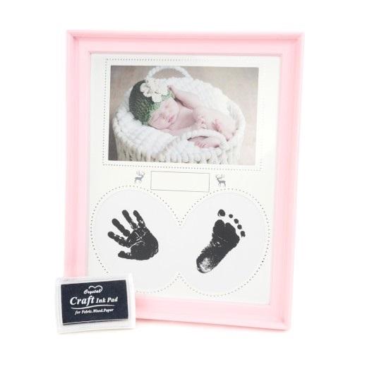 plastikowa ramka na zdjęcia, rozmiar ramki 22,2 x 27,4 cm, szerokość listwy 2 cm, do postawienia lub powieszenia, zawiera tusz do wykonania odcisku dłoni lub stopy dziecka
