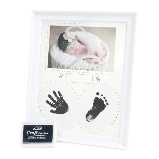 plastikowa ramka na zdjęcia, rozmiar ramki 22,2 x 27,4 cm, szerokość listwy 2 cm, do postawienia lub powieszenia, zawiera tusz do wykonania odcisku dłoni lub stopy dziecka