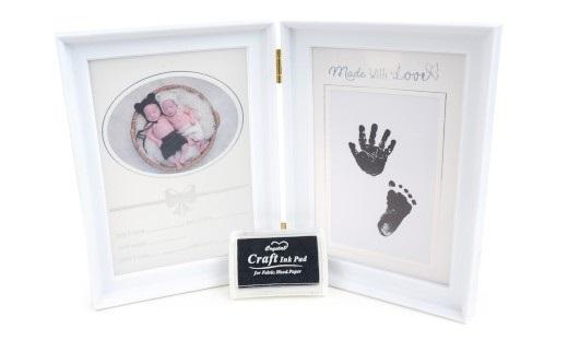 plastikowa podwójna ramka, rozmiar ramki 31,5 x 20,6 cm, szerokość listwy 2 cm, do postawienia, zawiera tusz do wykonania odcisku dłoni lub stopy dziecka