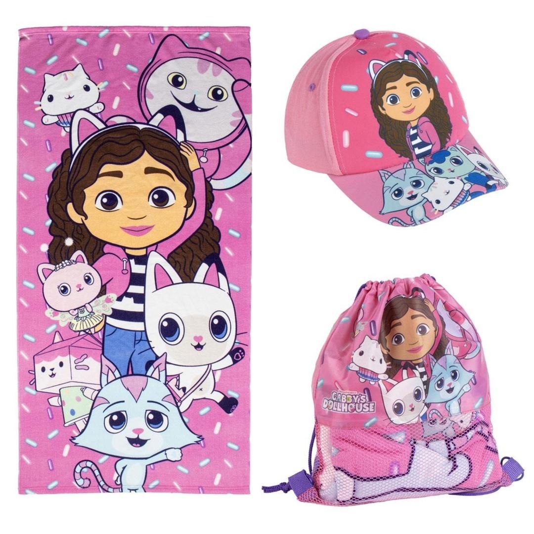 W skład zestawu wchodzi różowy ręcznik ozdobiony kolorowym nadrukiem przedstawiającym bohaterów bajki Koci Domek Gabi, który zapewnia komfort po kąpieli i dodaje radości każdej chwili odpoczynku. Do kompletu dołączona jest także różowa czapka z motywem Gabi i kociaków, idealna do ochrony głowy przed słońcem w ciepłe dni.