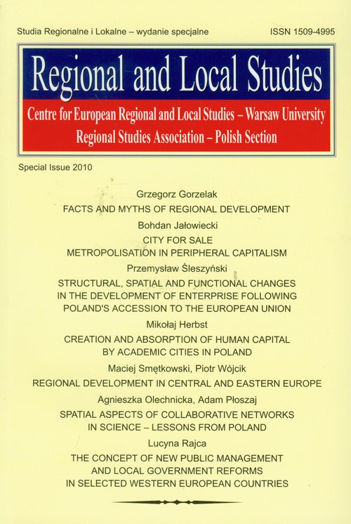 Facts and Myths of Regional Development City for Sale. Metropolisation in Peripheral Capitalism Structural, spatial and Functional Changes in the Development of Enterprise Following Poland's Accession to the European Union Creation and Absorption of Human Capital by Academic Cities in Poland Regional Development in Central and Eastern Europe Spatial Aspects of Collaborative Networks in Science - Lessons from Poland The Concept of New Public Management and Local Government Reforms in Selected Western European Countries