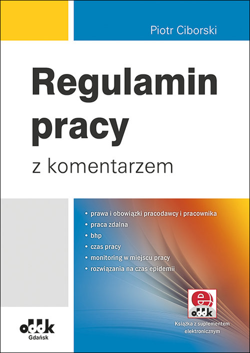 Zgodnie z przepisami Kodeksu pracy regulamin pracy ustala organizację i porządek w procesie pracy oraz związane z tym prawa i obowiązki pracodawcy i pracowników. Gotowy do wdrożenia regulamin pracy z dokumentacją szczegółowo określa organizację i porządek w procesie pracy oraz związane z tym prawa i obowiązki pracodawcy i pracowników. Książka zawiera także praktyczny komentarz do zagadnień związanych z opracowaniem, wejściem w życie, treścią i podstawą prawną regulaminu. Oprócz zagadnień takich, jak czas pracy, urlopy, ochrona rodzicielstwa i młodocianych, kary za naruszenie porządku i dyscypliny pracy, w książce zostały również uregulowane sprawy wywołujące kontrowersje, m.in.: kontrola pracowników na obecność alkoholu czy narkotyków, wyjścia prywatne w czasie pracy, korzystanie z telefonów służbowych, wygląd i ubiór pracownika na stanowisku pracy, kontrole wewnętrzne, odbiór prywatnej korespondencji, przeciwdziałanie mobbingowi, monitorowanie pracowników, a także zagadnienia dotyczące pracy zdalnej (przykładowy regulamin pracy zdalnej) oraz obowiązki pracodawcy i pracownika w zakresie bhp w czasie epidemii COVID-19. Suplement elektroniczny do książki zawiera treść regulaminu pracy wraz z załącznikami w edytowalnej formie. Plik suplementu do pobrania przez Internet – instrukcja w książce. Zainstalowanie suplementu wymaga systemu operacyjnego Windows. Stan prawny: 24 czerwca 2020 r. – zgodnie z ustawą z dnia 2 marca 2020 r. o szczególnych rozwiązaniach związanych z zapobieganiem, przeciwdziałaniem i zwalczaniem COVID-19, innych chorób zakaźnych oraz wywołanych nimi sytuacji kryzysowych (Dz.U. poz. 374 z późn. zm.) zmienioną ustawą z dnia 19 czerwca 2020 r. o dopłatach do oprocentowania kredytów bankowych udzielanych przedsiębiorcom dotkniętym skutkami COVID-19 oraz o uproszczonym postępowaniu o zatwierdzenie układu w związku z wystąpieniem COVID-19 (Dz.U. poz. 1086). Kogo dotyczy: Zgodnie z przepisem art. 104 § 11 k.p. pracodawca nie ma obowiązku wprowadzania regu­laminu pracy, jeżeli zatrudnia mniej niż 50 pracowników albo jeżeli organizację i porządek pracy w zakładzie i związane z tym prawa i obowiązki pracodawcy i pracowników okreś­lają postanowienia obowiązującego układu zbiorowego pracy. Pracodawca zatrudniający co najmniej 20 i mniej niż 50 pracowników wprowadza regulamin pracy, jeżeli zakładowa organizacja związkowa wystąpi z wnioskiem o jego wprowadzenie, chyba że w zakresie przedmiotowym przewidzianym dla regulaminu pracy obowiązują postanowienia układu zbiorowego pracy (art. 104 § 3 k.p.).