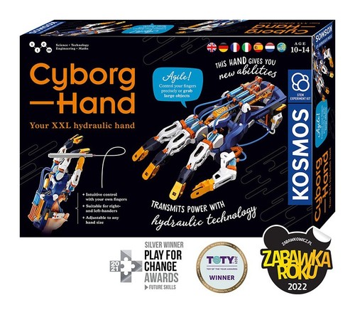 Zestaw edukacyjny, dzięki któremu możemy samodzielnie złożyć hydrauliczną rękę cyborga w formacie XXL! Podczas składania możemy poznać zagadnienia związane z mechaniką, elektroniką czy hydrauliką. Gdy ręka cyborga zostanie zmontowana ze znajdujących się w zestawie elementów, można nią sterować jak ludzką ręką. Obszerna instrukcja nie tylko informuje o przebiegu montażu ale także stanowi wprowadzenie w fascynujący świat cyborgów i egzoszkieletów. Ręka cyborga jest przystosowana dla prawo- i leworęcznych oraz nadaje się do ręki każdej wielkości. Dzięki niej możesz precyzyjnie sterować palcami lub chwytać duże przedmioty. Ponieważ ręka działa na zasadach hydrauliki, nie wymaga żadnego dodatkowego zasilania. Od 10 do 14 lat