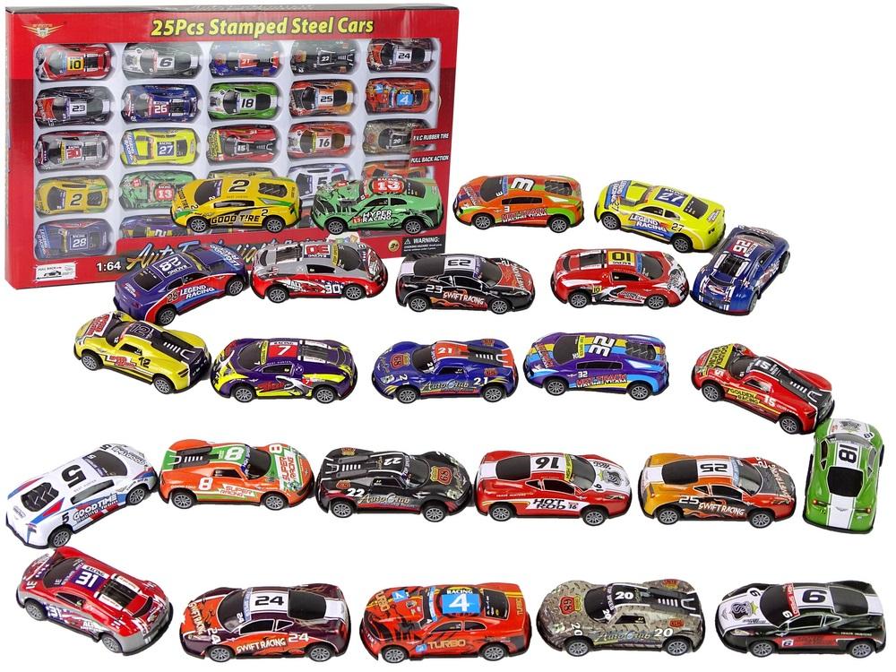 Zestaw Auta Sportowe Resoraki Metalowe Różne Kolory 25 Sztuk Duże terenowe auta i jazda ekstremalna to marzenie małych chłopców, ale także i dużych. Obdarowując kilkulatka zestawem różnokolorowych samochodzików, umożliwiasz chłopcu zabawę w przejażdżki po mieście, wyścigi, a także mechanika czy salon samochodowy. Rozbudzisz w nim pasję i zainteresowanie motoryzacją. Wiele autek terenowych, jeepów, zasili kolekcję fana motoryzacji. Będziesz mógł tworzyć ekstremalne tory przeszkód dla samochodów. Każdy detal jest wykonany z najmniejszym szczegółem i dokładnością. W zestawie znajduje się 25 autek, każdy jest indywidualny, w innym kolorze i z różnym wyglądem. Wszystkie wykonane w skali 1:64 i posiadają napęd pull-back. Wystarczy pociągnąć do tyłu i puścić, a rozwiną niesamowitą prędkość. Prezentowany zestaw resoraków odznacza się wieloma zaletami. Główną z nich jest budowa autek, karoseria wykonana jest z metalu, natomiast spód zabawki i koła to plastik. Połączenie to sprawia, że autka są odporne na lekkie zderzenia, a zabawa nimi to wygoda i komfort. Wystarczy znaleźć miejsce i rozpocząć zabawę! Średni wymiar autek: 8 cm x 3 cm x 3 cm Wymiary opakowania: 48 cm x 27 cm x 4 cm Zestaw autek przeznaczony jest dla wszystkich dzieciaków powyżej 3. roku życia. Sprawdzi się zarówno jako zestaw dla jednego chłopca, jak i wyposażenie sali zabaw lub przedszkola. Resoraki zostały zapakowane w estetyczne, kolorowe pudełeczko z przeźroczystą witrynką. Zestaw posiada oznakowanie certyfikatem CE, ponadto jego produkcja jest zgodna z normą EN 71.