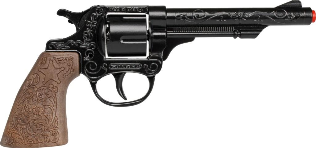 Rewolwer kowbojski metalowy na 8 naboi z bębenkiem. Wymiary: 20,5x11,5cm. Wiek: 3+.