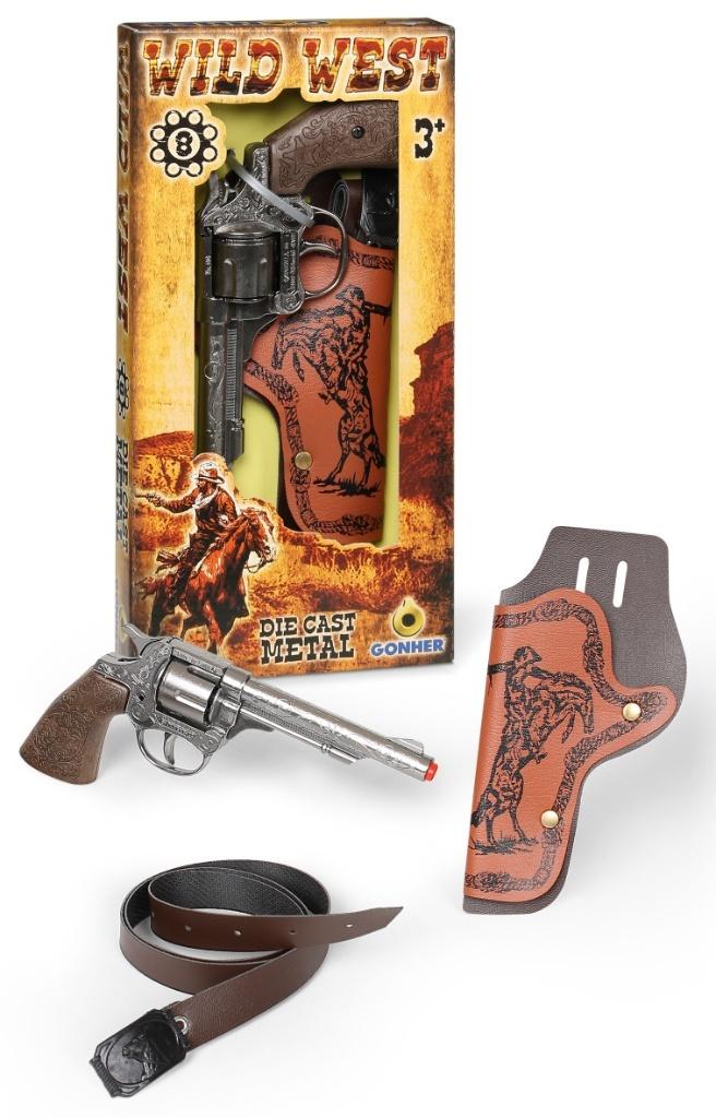 Metalowy rewolwer kowbojski na 8 naboi z kaburą. Wiek: 3+. Szt./karton: 12