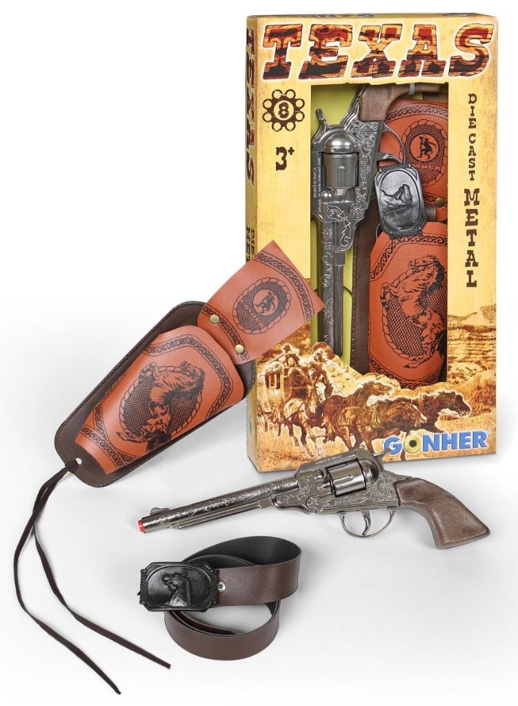 Metalowy rewolwer kowbojski na 8 naboi w zestawie z kaburą i paskiem. Wiek: 3+. Szt./karton: 10