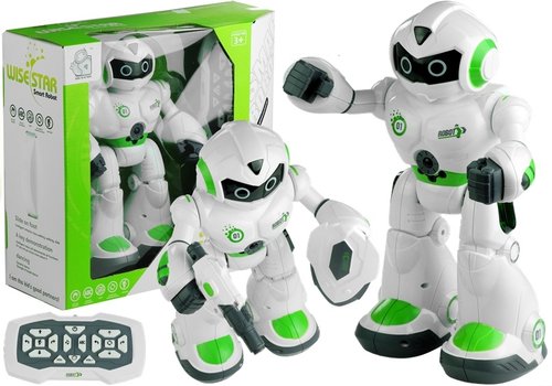 Chodzący inteligentny robot Kosmiczny robot na baterie, który chodzi, tańczy, śpiewa, mówi i uczy języka angielskiego. Robot sterowany jest dołączonym do zestawu pilotem na podczerwień, ale reaguje również na gesty dziecka. Robot posiada ukryte w bocznych częściach głowy głośniki, światła LED w oczach oraz odbiornik sensorycznych gestów, który znajduje się w centralnym miejscu robota. W zestawie znajduje się: - robot, - tarcza, - kosmiczna broń z ładunkiem, - wielofunkcyjny pilot, - instrukcja obsługi. Robot mówi i śpiewa w języku angielskim. Po włączeniu lub wyłączeniu zabawki, a także po 30 i 90 sekundach, podczas których maluch nie używa zabawki, a ona jest włączona, robot mówi jeden z kilku tekstów, w tłumaczeniu na język polski brzmiący: - cześć, jestem Twoim dobrym przyjacielem, potrafię śpiewać, tańczyć i mówić po angielsku, - pamiętaj, by pobawić się mną następnym razem, - gdzie jesteś mój przyjacielu? Jestem taki samotny, - chciałbym odpocząć przez chwilę. Robot jest bardzo inteligentną zabawką. Gdy baterie są na skraju wyczerpania, informuje o tym, mówiąc: uwaga! Poziom baterii jest niski lub nie mam siły, Panie, przyjdź i pomóż mi, dodając energię. Zabawka posiada pięć stopni głośności, którą można zmieniać, naciskając odpowiedni guzik na pilocie. Gdy zostanie wybrane maksymalne natężenie głosu, przy kolejnym wciśnięciu guzika pojawi się informacja, mówiąca o tym, że najwyższy poziom został już wybrany — identycznie działa to podczas zmniejszania głośności. Robot chodzi do przodu i do tyłu, obraca się w prawo i lewo potrafi to zrobić, podnosząc nogi, a także ślizgając się po powierzchni, na której jest ustawiony. Każdy ruch robota opatrzony jest informacją głosową, informującą o tym, co robi. Zabawka tańczy do wesołej piosenki, zachęcając malucha do wspólnej zabawy. Również podczas śpiewania aktywuje dziecko, nawołując do aplauzu bądź wspólnego śpiewania. Wybierając opcję nauki języka angielskiego, kosmiczna zabawka uczy podstawowych zwrotów, takich jak: hello, nice to meet you czy thank you, czyli cześć, miło Cię poznać, dziękuję, a także nazw owoców: strawberry, peach, coconut, oznaczających truskawkę, brzoskwinię i kokosa oraz nazw pojazdów: bicycle, car, oznaczających rower i samochód — to tylko niektóre z nich. Co istotne, zabawkowy robot posiada funkcję DEMO, podczas której sam tłumaczy swojemu małemu właścicielowi, jakie opcje ukrywa, oraz jak należy się nim zajmować. Zabawka zasilana jest 3 sztukami baterii 1,5 V AA, natomiast pilot - 2 sztukami. Wesoły robot wykonany jest z solidnego materiału, jakim jest plastik, co odpowiada za jego długą żywotność. Wymiary elementów zabawki: - robot: 27 cm x 20 cm x 10 cm, - broń: 11 cm x 7 cm x 3,5 cm, - tarcza: 12 cm x 7,5 cm x 3 cm, - pilot: 15 cm x 8,5 cm x 3,5 cm. Wymiary opakowania: - 33 cm x 13 cm x 30 cm.