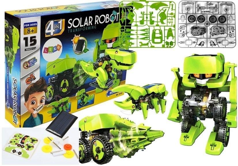 Robot Solarny 4 w 1 Tyranozaur Rex Owad Zestaw Edukacyjny Naukowy Dzieci zwykle interesują się nowinkami techniki w dzisiejszych czasach! Dlatego często zadają dużo pytań lub rozbierają urządzenia.Zabawa pozwoli małemu majsterkowiczowi rozwinąć cierpliwość i dokładność, precyzje oraz kreatywne myślenie co z pewnością przyczyni się pozytywnie do rozwoju dziecka. Wykorzystując energię słoneczną zamiast baterii, roboty przekazują wiedzę na temat alternatywnych źródeł energii, podczas gdy Twoje dziecko bawi się na słońcu. Brak konieczności użycia standardowych baterii). Na pewno spodoba się Twojemu dziecko to że robota słonecznego można zbudować w 4 wersjach. Podekscytowanie będzie duże, a poczucie wyzwania pozwoli mu dążyć do celu. Cztery modele: - robot- ruchome nogi i koła - Tyranozaur Rex, porusza szczęką - insekta- ruchome nogi i szczęki - machina wiercąca - ruchome koła Wiele możliwości w jednym zestawie. Elementy zestawu: - zestaw części do robotów - panel słoneczny - silniczek - instrukcje obsługi Wymiary pudełka: 24 cm x 18 cm x 7 cm Zestaw przeznaczony jest dla dzieci powyżej 8. roku życia. Zestaw posiada certyfikat CE i jest zgodny z normą EN 71. Zapakowany jest w kartonik z naukową grafiką, dzięki czemu nadaje się idealnie na prezent.