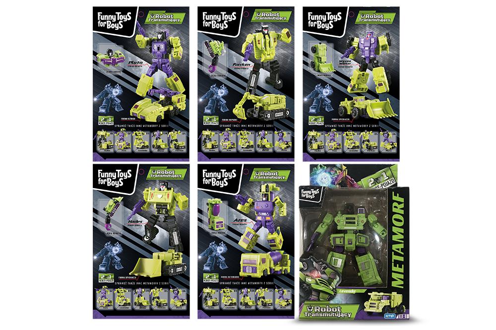 Robot transumtujący. Możliwość przekształcenia robota w koparkę, spychacz, betoniarkę, ciężarówkę, dźwig w zależności od wzoru. Różne wzory, towar wysyłany losowo.