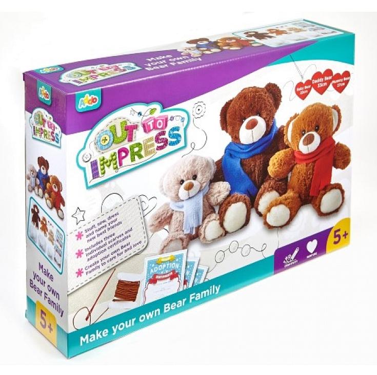 MOJA WŁASNA PRZYTULANKA- RODZINA MISIÓW Stwórz swoje własne przytulanki – rodzinę misiów - z tym zestawem. Wypełnij je puchem, zszyj i nadaj im imię! Uzupełnij dla nich certyfikat adopcji, żeby nie zapomnieć o ich urodzinach. Zawartość: • 3 misie, • 3 certyfikaty adopcji, • 3 wypełnienia misiów, • plastikowa igła z trzeba nićmi, • 3 szaliki • instrukcja Wymiary opakowania: 30 x 45 x 10 cm Produkt przeznaczony dla dzieci powyżej 5. roku życia