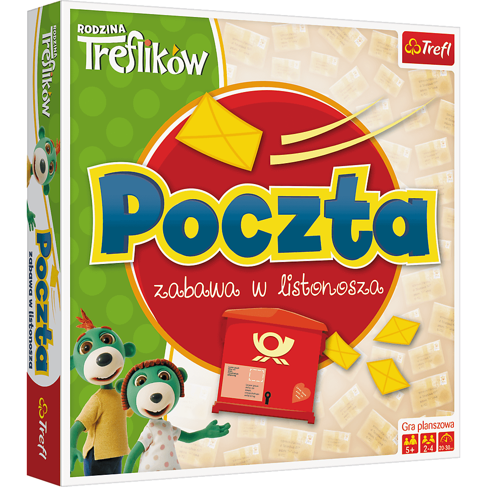 Rodzina Treflików - Poczta: zabawa w listonosza to rodzinna gra planszowa opartna na licencji serialu Rodzina Treflików. Tym razem bohaterowie popularnej bajki mają za zadanie dostarczyć listy i paczki postaciom z popularnej bajki. Odwiedź miejsca znane z serialu i sprawdź, czy mieszkańcy są w domu. Masz przecież dla nich list! Zawartość: plansza, 4 pionki, 4 podstawki pod pionki, 16 żetonów przesyłek, 4 żetony ciastek, kostka, 27 kart, instrukcja Liczba graczy 2-4 Wiek 5+