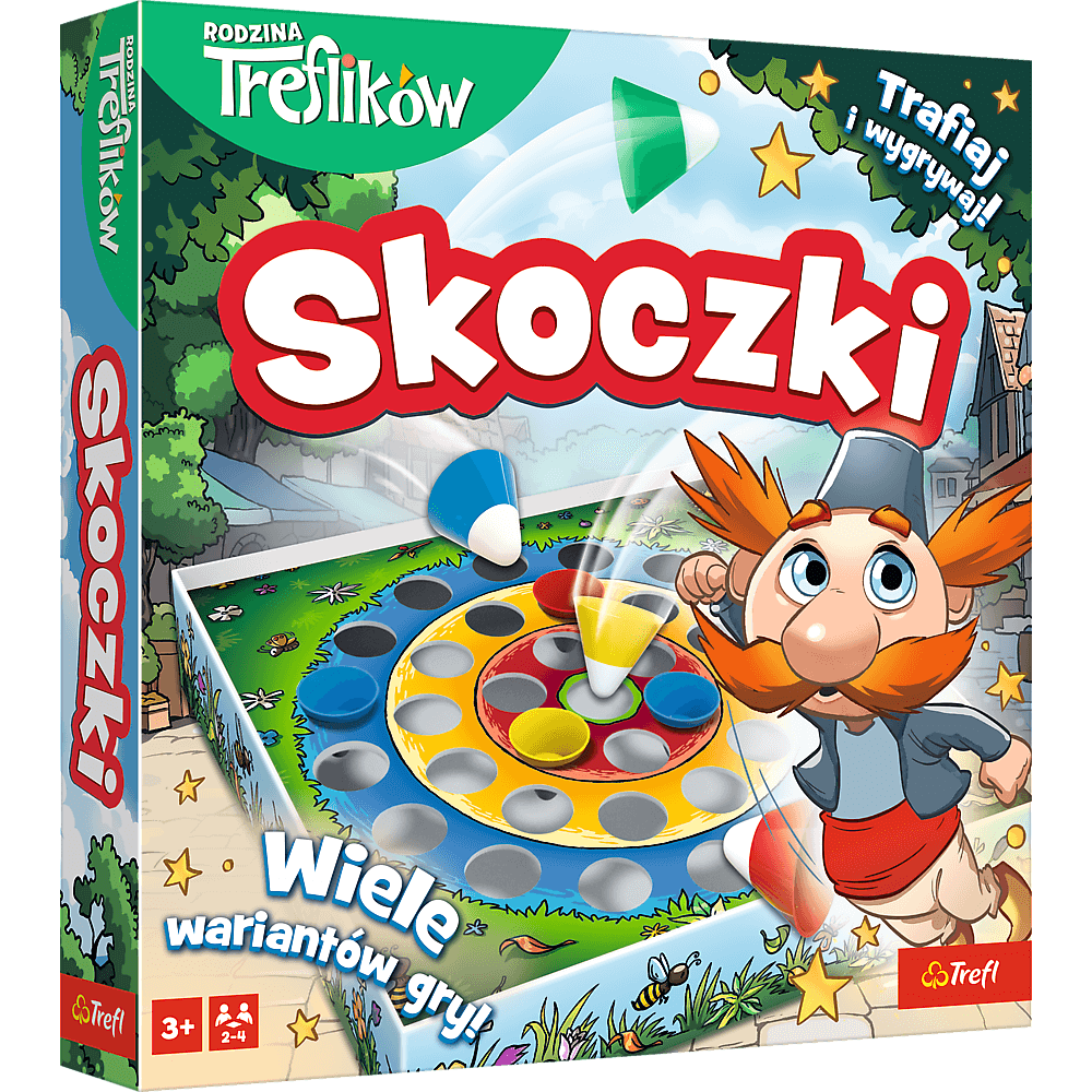Skoczki na licencji serialu Rodzina Treflików to prosta gra zręcznościowa dla całej rodziny. Kto okaże się najlepszym strzelcem i trafi swoimi skoczkami w środek specjalnej tarczy? Przekonajcie się już teraz! Bohaterowie znanej bajki Rodzina Treflików zapraszają do wspólnej zabawy. Wiek graczy: 3+ Liczba graczy: 2-4 Czas rozgrywki: 20 minut