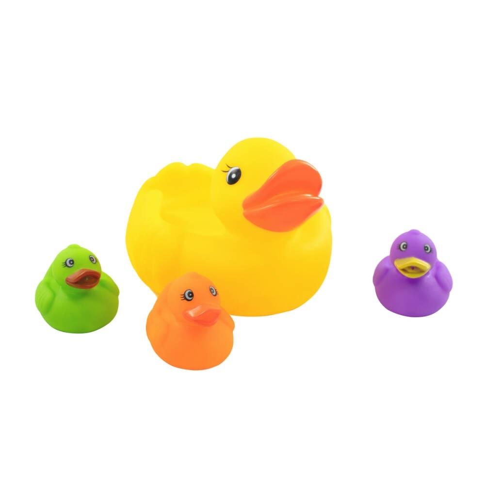 Mama kaczuszka z 4 malutkimi kaczuszkami. Po ściśnięciu wydobywają dźwięk. Z pewnością umilą kąpiel maluszkowi. Produkt przeznaczony dla dzieci powyżej 18 miesiąca życia.