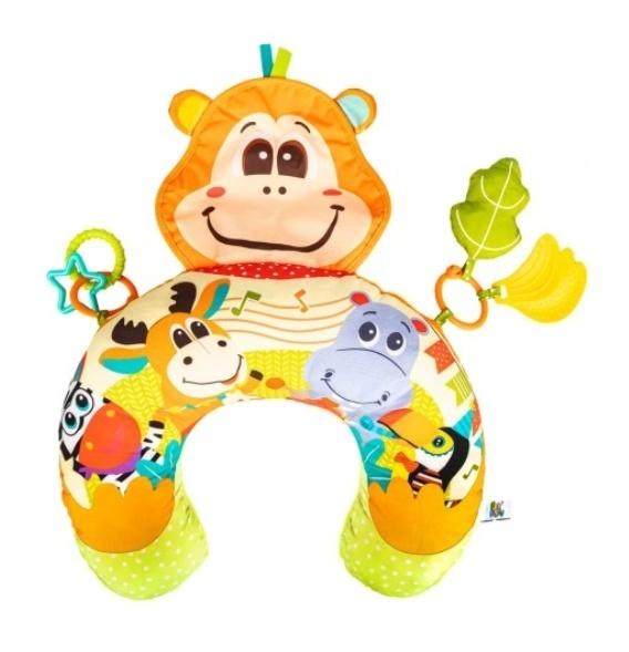 Kolorowa podusia zapewni wsparcie maluszkowi leżącemu na brzuchu i zabawi go wesołymi obrazkami zwierzaczków! Poduszka wykonana została z materiałów różniących się kolorem, nadrukiem, a także fakturą, co pozwoli rozwijać zdolności poznawcze dziecka. Doszyta małpia głowa zabawnie szeleści przy dotykaniu, a przymocowane do poduszki zabawki zapewnią małym rączkom dodatkowe zajęcie. Na jednym z odczepianych kółeczek znajdziemy twarde kształty, a na drugim piszczałkę w kształcie listka i miękki gryzak w kształcie kiści bananów.