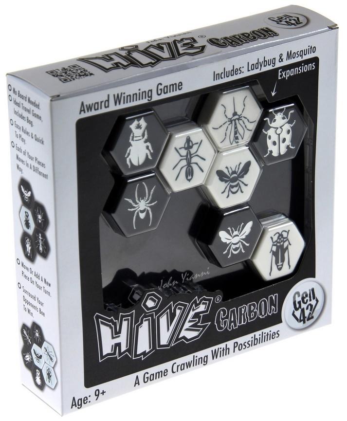 Rój Carbon"" to ekskluzywna wersja popularnej, znanej na całym świecie gry logicznej. To równie wspaniała gra, jak standardowa wersja, aczkolwiek w alternatywnej szacie graficznej. Jest to ukłon w stronę wszystkich miłośników klasycznej, czarno-białej kolorystyki. Nie będziemy opowiadać się po żadnej ze stron w dyskusji: ""która wersja jest lepsza?"", ale znamy opinię niektórych graczy, że Rój Carbon w końcu przypomina grę w szachy... Rój jest grą dla dwóch graczy. Każdy gracz ma trzynaście płytek, przedstawiających siedem różnych owadów: pszczoła (królowa), żuk, konik polny, pająk, mrówka, biedronka i komar. Ciekawostka: biedronka i komar są dodatkami, które zostały dołączone na stałe do wersji Carbon. W wersji standardowej, kolorowej Roju, trzeba je zakupić osobno. Celem gry jest otoczenie królowej przeciwnika. Gracze wykonują swoje ruchy na zmianę. W swoim ruchu mogą albo dołożyć owada do roju, albo przesunąć jedną z wcześniej zagranych płytek. Każda płytka posiada unikalny sposób poruszenia (jak w szachach), naśladujący ruch przedstawionego na niej owada. Na przykład, konik polny jest jedynym owadem potrafiącym przeskakiwać inne płytki. Proste reguły i ogromna ilość dostępnych kombinacji, sprawiają, że Rój jest prawdziwym wyzwaniem dla graczy, ceniących sobie intelektualną rozrywkę. Gracze muszą wykazać się umiejętnościami strategicznego planowania, taktycznego myślenia i wyobraźni przestrzennej. Kluczem do zwycięstwa jest sprytne atakowanie królowej przeciwnika i pozostawienie wystarczających odwodów do obrony własnej. Gra została wyróżniona wieloma prestiżowymi nagrodami. ZAWARTOŚĆ: 26 płytek 1 torba na płytki instrukcja