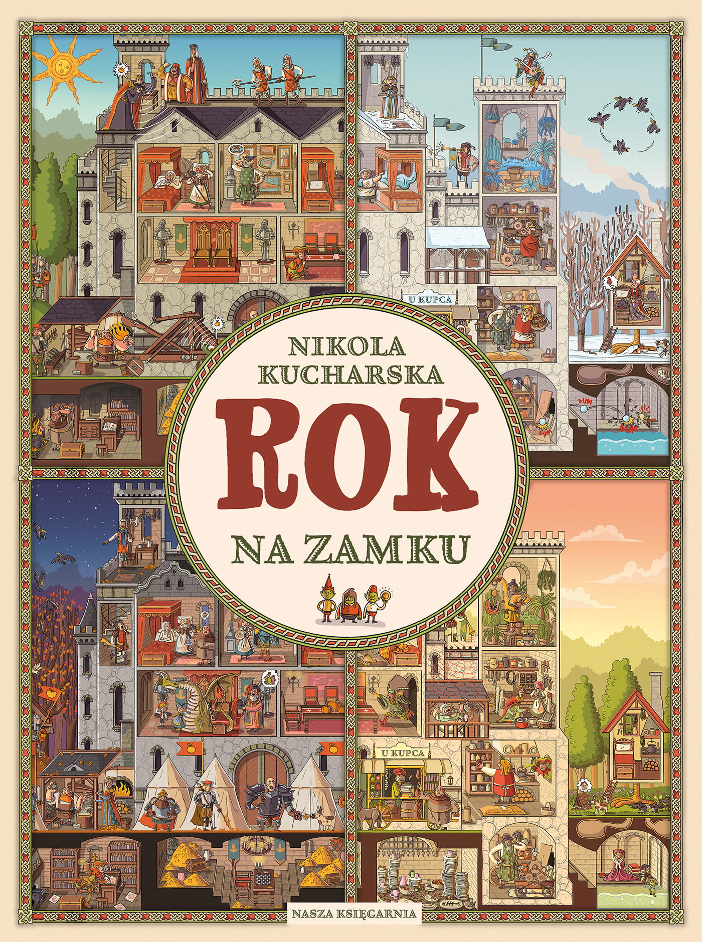 Witajcie na zamku króla Bolebora i królowej Drogomiry! Spędzicie na nim cały rok. Będzie się dużo działo. Poznacie wielu jego mieszkańców: królewskie córki, szukającego miłości barda, samotnego ducha, mnicha Bławatka, płatającego figle błazna Dzwonka, wiecznie kłócących się królewskich doradców i wielu, wielu innych. Dowiecie się, jak przez przypadek można doprowadzić do wojny, kto burzy spokój królewskiego skarbnika, czy królewnie Samboi uda się zostać rycerką oraz do czego mogą się przydać wynalazki królowej i rośliny hodowane przez ogrodnika Wacława. Zapraszamy na zamek, gdzie przeżyjecie fantastyczne przygody! „Rok na zamku” można oglądać godzinami. Ta niezwykła książka pobudza wyobraźnię, rozwija spostrzegawczość, umiejętność opowiadania, a przede wszystkim gwarantuje świetną zabawę. Nikola Kucharska – ilustratorka i autorka książek, komiksów i gier planszowych dla dzieci i młodzieży. Ukończyła projektowanie graficzne na katowickiej ASP. Ma na koncie kilkadziesiąt książek. Współpracuje z wieloma wydawcami w Polsce, Francji, Chinach, Rosji, Korei, Niemczech czy Hiszpanii. Jej „Podróż dookoła świata. Północ–południe. Wschód–zachód” nominowano w konkursie PTWK Najpiękniejsza Książka Roku 2016, a „Zwierzęta, które zniknęły. Atlas zwierząt wymarłych” (teksty: Katarzyna Gładysz, Joanna Wajs i Paweł Łaczek) otrzymały nagrodę główną w konkursie Mądra Książka Roku 2018, wyróżnienie w XVII edycji konkursu Świat Przyjazny Dziecku oraz nominację w konkursie Przecinek i Kropka Najlepsza Książka Roku 2018.