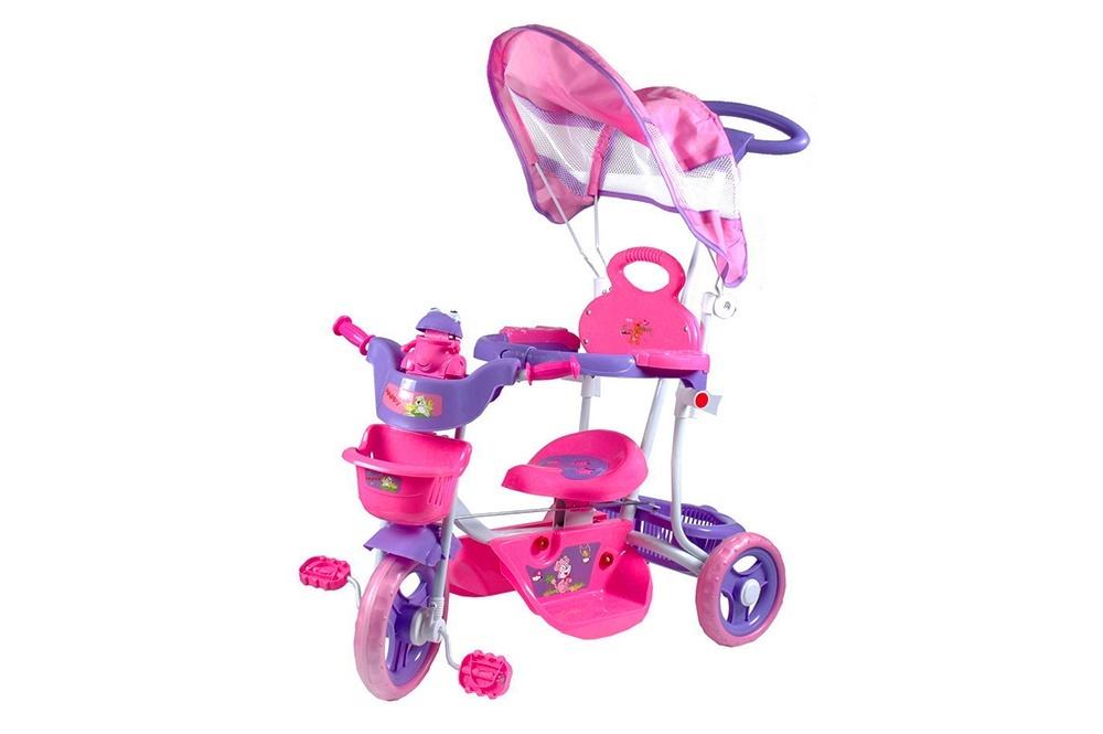Rowerek trójkołowy z baldachimem, rączką do pchania i sterowania z muzyczną zabawką.