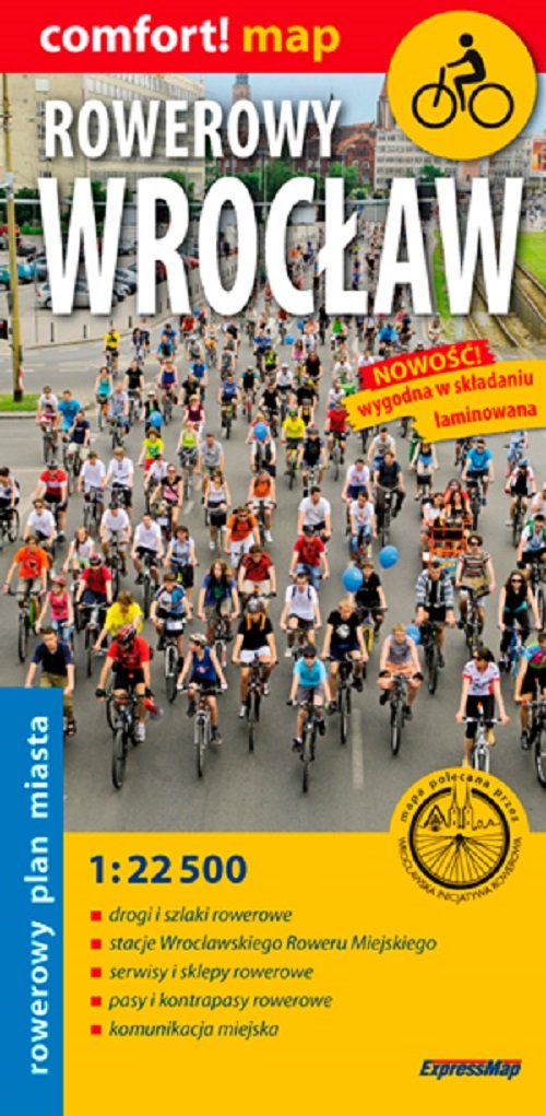 Dwustronnie laminowany, wygodny w składaniu rowerowy plan Wrocławia w pełnych granicach administracyjnych • plan opracowany we współpracy z aktywistami z Wrocławskiej Inicjatywy Rowerowej • bogata treść rowerowa: • turystyczne szlaki rowerowe, wydzielone drogi rowerowe, pasy i kontrapasy rowerowe, strefy piesze z dopuszczonym ruchem rowerowym, ulice jednokierunkowe dopuszczone do dwukierunkowego ruchu rowerowego • stacje rowerów miejskich, parkingi rowerowe, serwisy i sklepy rowerowe, samoobsługowe stacje naprawy rowerów • najważniejsze przepisy kodeksu drogowego dotyczące rowerzystów • szczegółowy rysunek zabudowy • linie autobusowe i tramwajowe wraz z przystankami • sygnalizacja świetlna, ulice jednokierunkowe • treść turystyczna, m.in.: zabytki, muzea i inne istotne obiekty • budynki użyteczności publicznej, centra handlowe • szczegółowy plan centrum w skali 1:10 000 (1 cm – 100 m) • skorowidz ulic