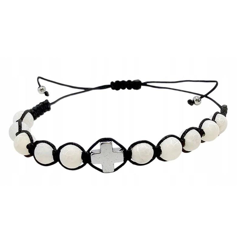 Odkryj subtelne piękno i duchowy charakter naszej regulowanej bransoletki. Wykonana z 10 gładkich koralików z białego kamienia o wielkości 6 mm, nałożonych na wytrzymały, czarny sznurek. Bransoletka może służyć jako dziesiątka różańca, a jej centralnym punktem jest minimalistyczny krzyżyk z hematytu o wymiarach 8x8 mm. Dzięki regulowanemu sznurkowi, idealnie dopasowuje się do każdego nadgarstka. Pięknie zapakowana, stanowi wspaniały prezent.