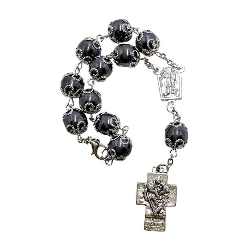 Dziesiątka różańca z hematytu ze Świętą Rodziną i Świętym Krzysztofem