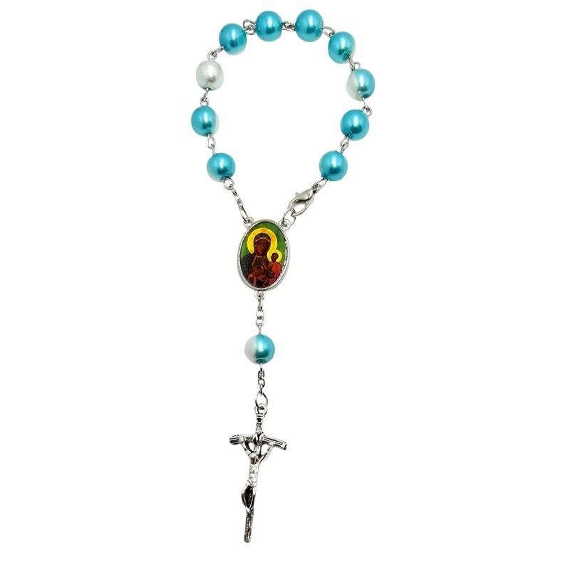 Zapinana Dziesiątka Różańca do samochodu Biało-Niebieska z Perłowym połyskiem - Matka Boska Częstochowska / Św. Krzysztof , Krzyż Papieski.