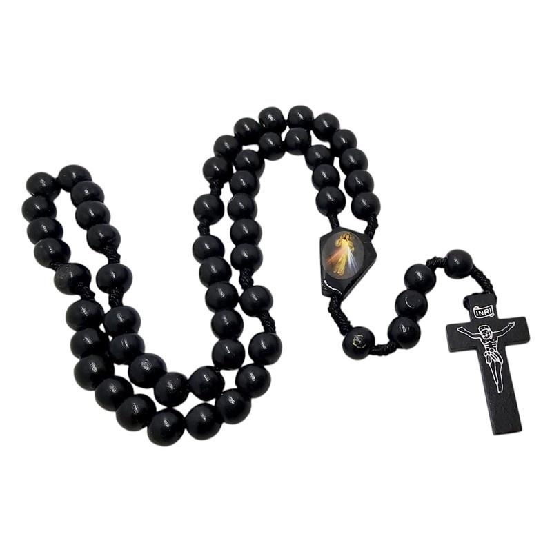 Czarny Drewniany Różaniec na Sznurku - Jezus Miłosierny