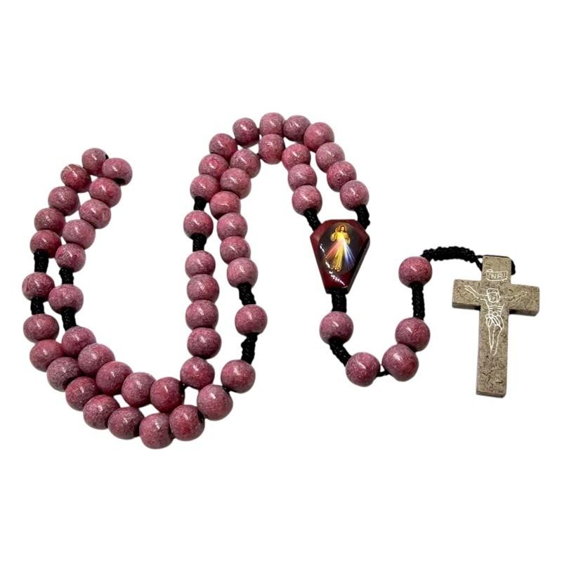 Różowy Drewniany Różaniec na Sznurku - Jezus Miłosierny