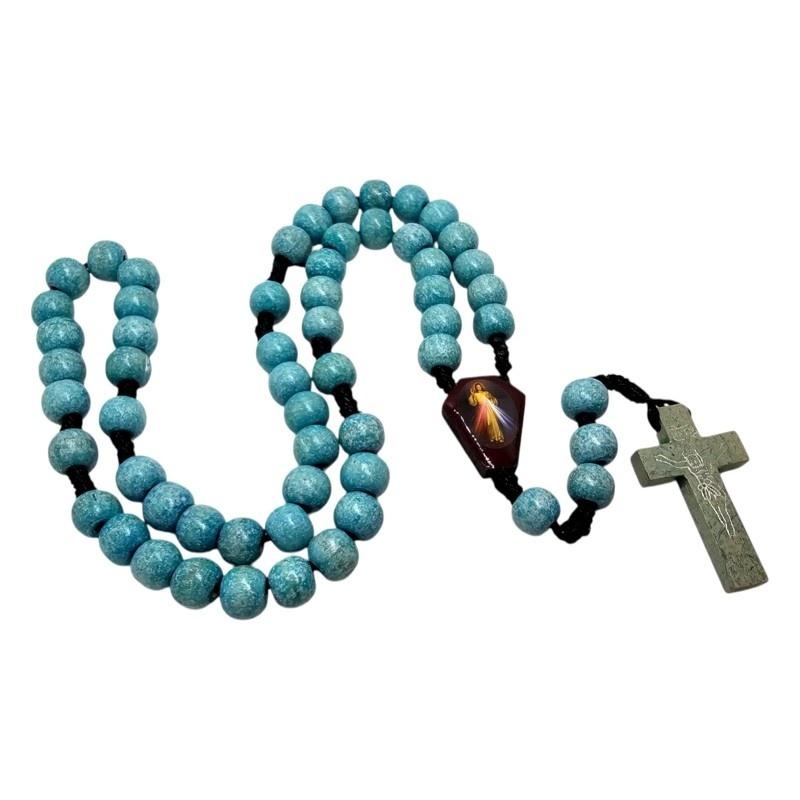Turkusowy Drewniany Różaniec na Sznurku - Jezus Miłosierny