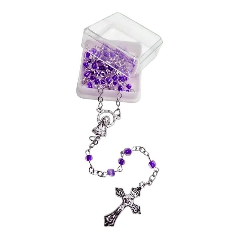Koraliki różańca wykonane są z przeźroczystego plastiku, w którego środek ma głęboki, fioletowy kolor. Takie połączenie nadaje im wyjątkowej elegancji i atrakcyjnego efektu wizualnego, nawiązującego do barwy szat liturgicznych i królewskiej godności. Koraliki mają około 4 mm wielkości.