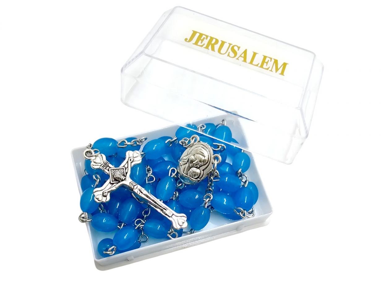 Niebieski Różaniec Szklany Owalny w Pudełku.