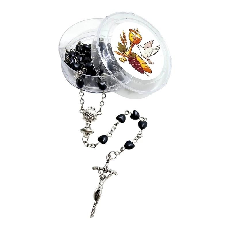 Elegancki Różaniec Komunijny z Czarnych Koralików w Kształcie Serca - Papieski Krzyż (50 cm)