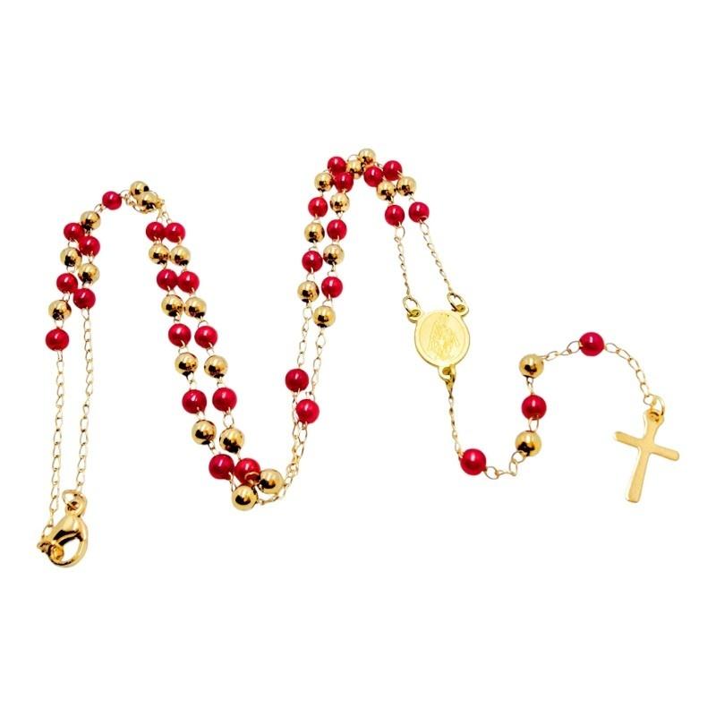 Wyjątkowo piękny i subtelny różaniec zapinany, zaprojektowany z myślą o noszeniu jako elegancki łańcuszek na szyję lub do zawieszenia. Wykonany z trwałej stali nierdzewnej, różaniec jest pozłacany, co gwarantuje długotrwały blask i odporność na utratę koloru. Charakteryzuje się wyrazistym, ale delikatnym akcentem w postaci koralików: kuleczki złote są naprzemiennie przeplatane z intensywnie czerwonymi. To połączenie symbolizuje miłość i królewską godność, czyniąc go bardzo efektownym.
